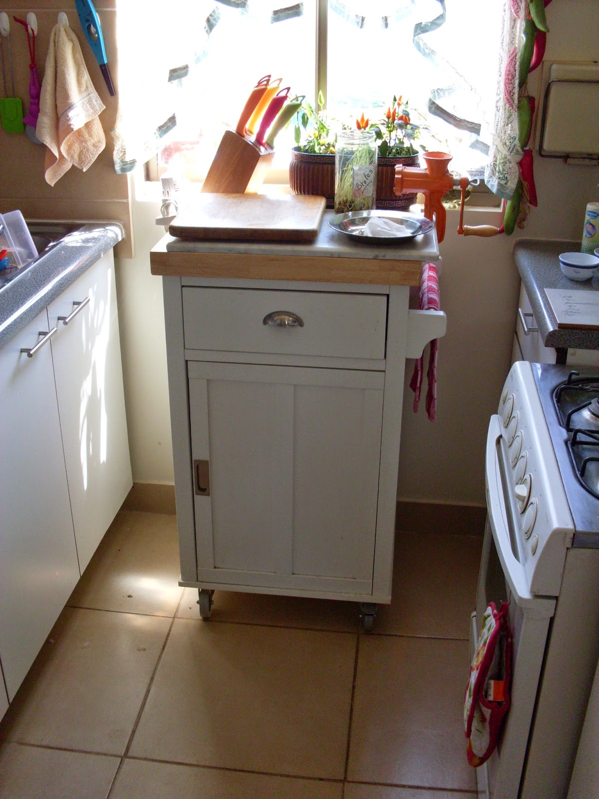 Así fue como encontré mi mueble regalón y que he utilizado en proyectos de clientes. Se ha llevado aplausos. Al tener ruedas industriales de cobertura de silicona se deslaza muy facilmente dentro del espacio, proyectando los mesones y ayudando donde le necesite. Tiene un cajón en donde guardo todos los cuchillos de cocinar y un puerta inferior donde tengo picadoras, moledores, rayadores, etc. O sea, tiene una tremenda capacidad para almacenar. Al costado puedes colgar los paños de cocina y su superficie es muy firme. Sobre ella puedo lucir una pieza de mármol y una tabla de lenga que utilizo para cortar y picar carnes o vegetales.